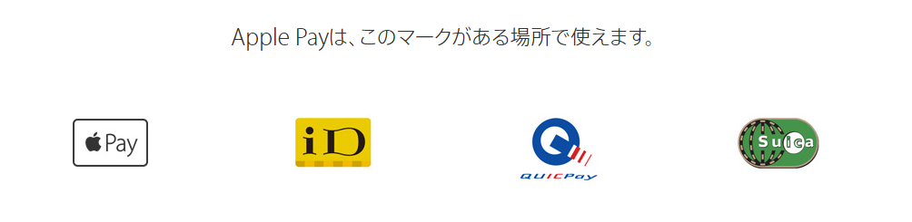 Apple Payでは、各カード会社のシステムが独自にApple Payを認証するのではなく、iD、Quick Pay、Suicaの仕組みを利用します。したがって、お店でApple Payが使えるかどうか判断するときには、MasterCardなどのカードのマークを探すのではなく、下記のマークを探しましょう。自分の持っているMasterCardでいつも買い物をしているお店であっても、下記のマークのサービスに対応していないとApple Payの支払いはできないということになります。