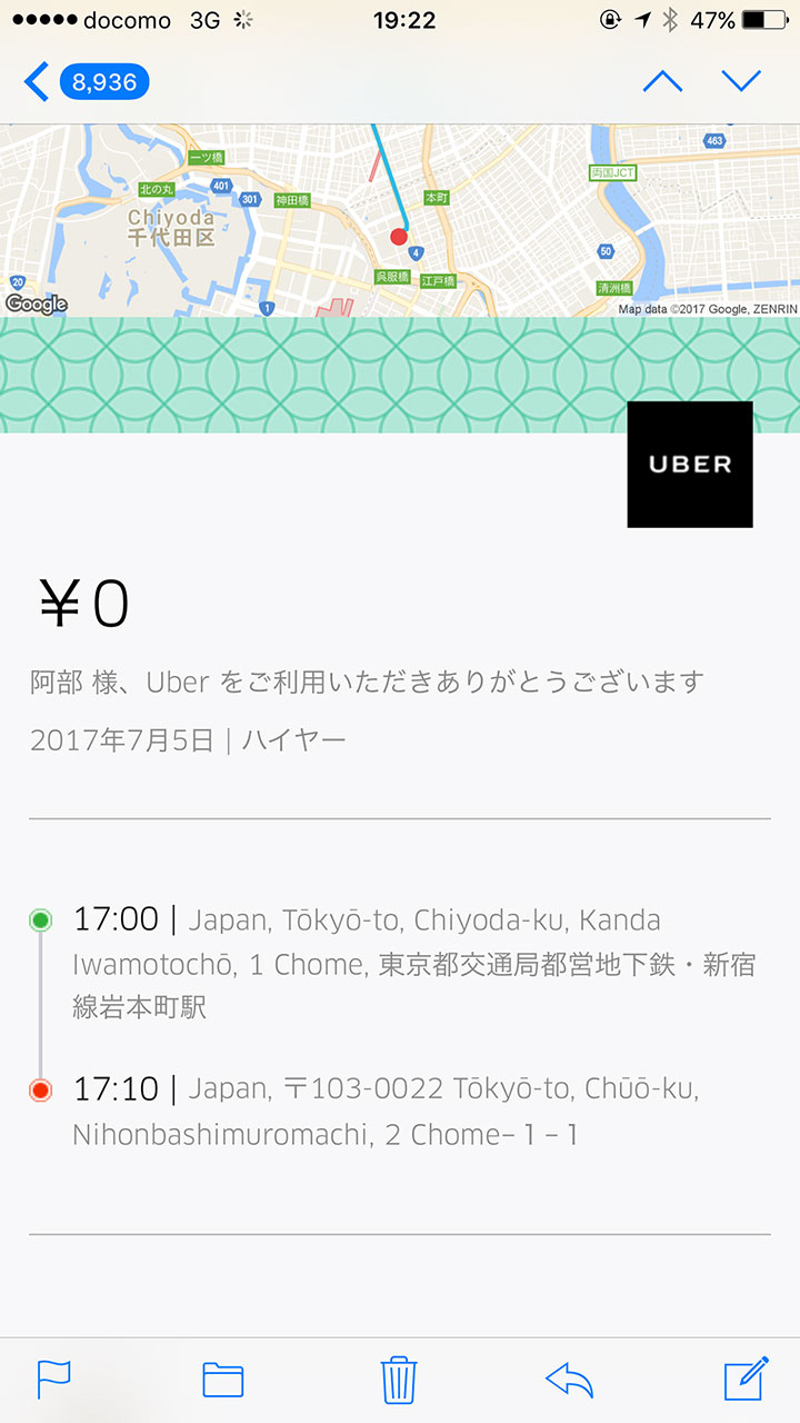 - 車を降りたら数分後に領収書が送られてきます。ドライバーさんの評価をして終了です!