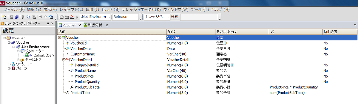 それでは早速、実際のGeneXusの開発画面を見ていきながらその実装方法を見ていきましょう。今回は伝票のデータを管理するトランザクションを作成し、その中で「顧客名」を入力する欄に対して入力を必須にするというルールを適用させます。