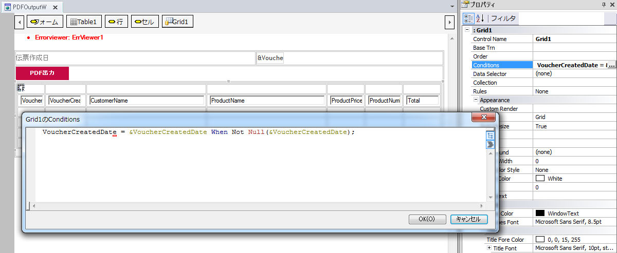 指定された伝票作成日でデータの絞込みを行うためGridのConditionsプロパティに下記の内容を設定しておきます。