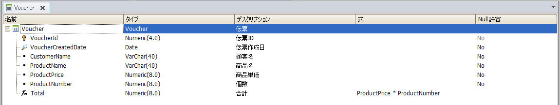 それでは早速PDF出力の手順をご紹介しましょう。今回は伝票データから伝票作成日をユーザーが指定して、指定された日付の伝票データのみPDF出力するという流れで実装をおこなっていきたいと思います。まず、伝票データを管理するトランザクションを作成します。項目属性などは下記の内容で指定します。