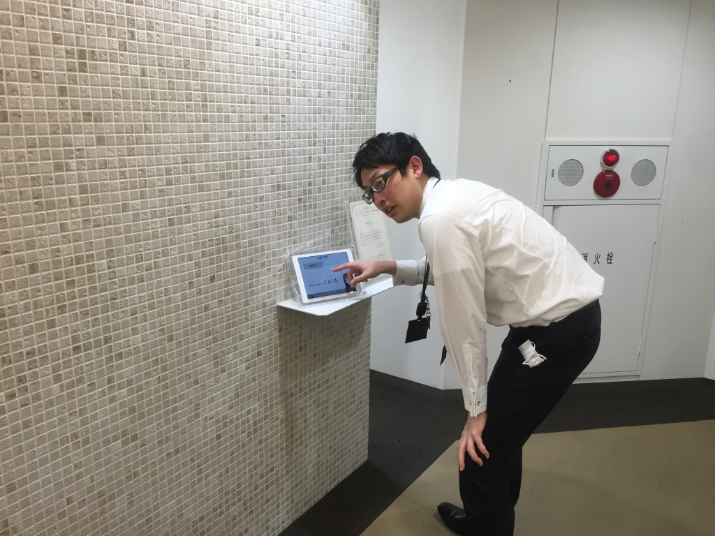 中山くんにiPad受付機を使ってもらおうとおもいます。ちょっと緊張しているようです。