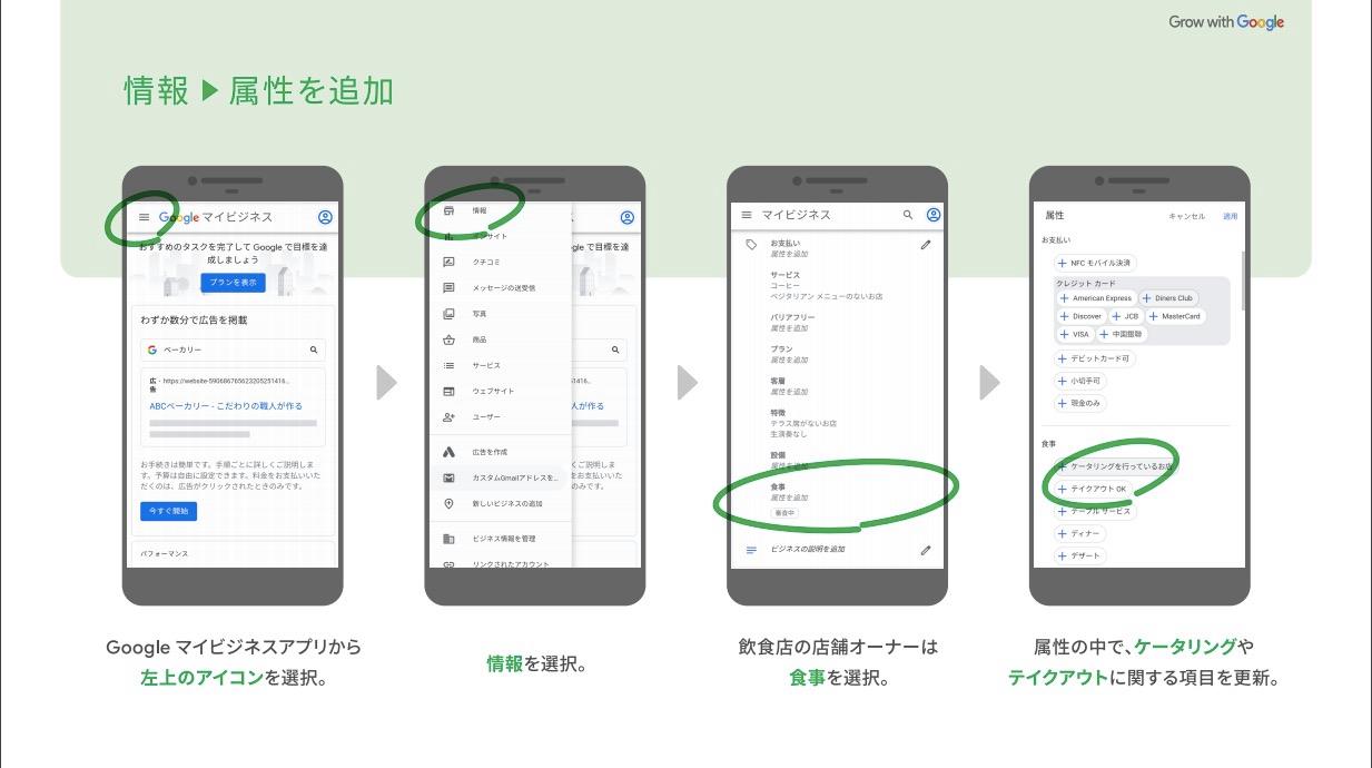 テイクアウトやデリバリーの情報は、Googleクローラーが収集するのではなく、店舗運営者がマイビジネスで設定する必要があります。