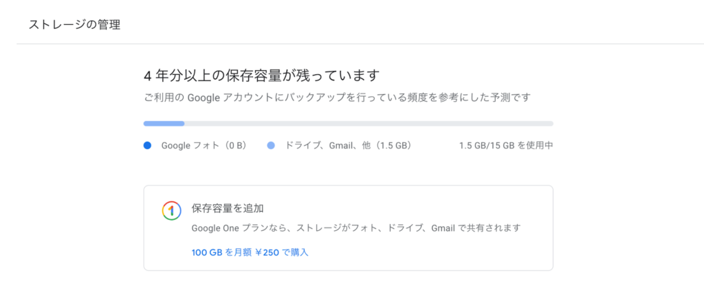 ちなみに、Googleがあなたのストレージ使用頻度を計算し「○年分以上の保存容量が残っています」と目安を示してくれます。