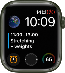ワークアウトの目標に対する達成率を円形のサークルで表示する、お馴染みの文字盤です。もちろん、アクティビティのコンプリケーション自体は他の文字盤でも設定可能です。