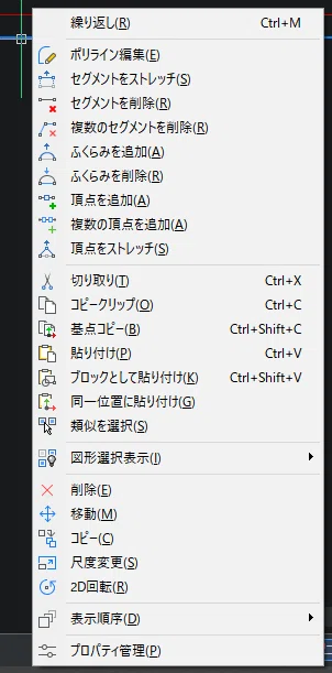 まず「SHORTCUTMENU」や「SHORTCUTMENUDEFAULT」を0に設定すると、右クリック=Enterに近い動作になり、コマンド確定がスピーディーに行えます。また、図形を選択している状態でも右クリックを押すと、AutoCADと似た感覚でコマンド再実行が簡単にできるようになります。