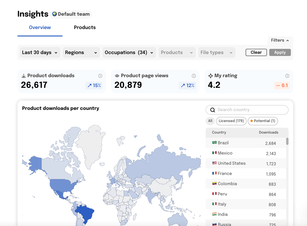 特に海外展開を考える企業にとって、BIMobject経由で入手できるダウンロード分析データは魅力的です。どの国からダウンロードが多いか、どんな製品が人気なのかが可視化されるので、市場調査やマーケティング戦略立案にも活用できます。