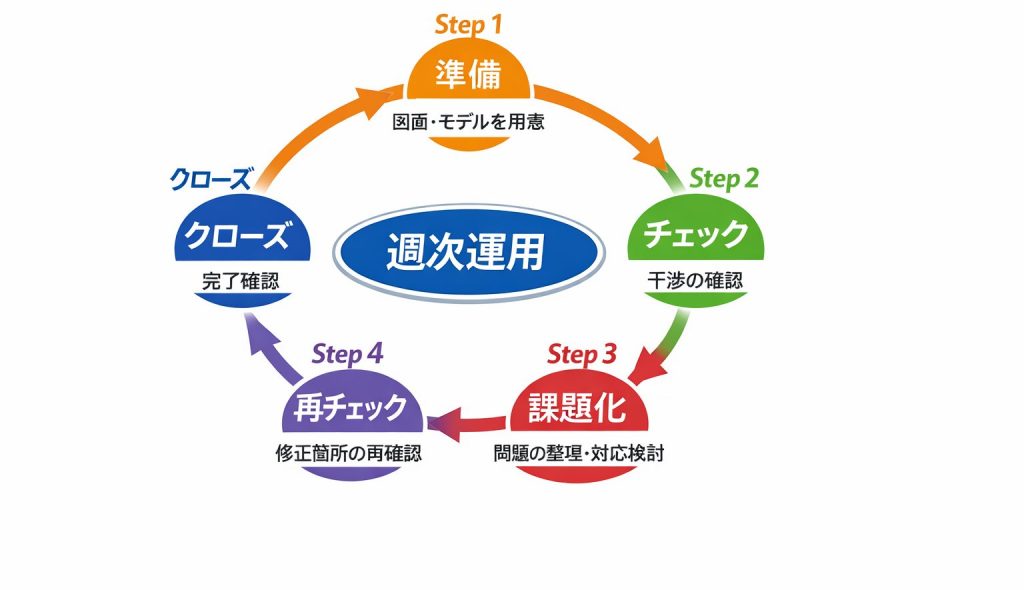 干渉チェックは、検出して終わりにすると効果が出ません。現場で成果につなげるには、準備→チェック→課題化→再チェックまでを一連のサイクルとして回す必要があります。ポイントは、ツール操作よりも「運用が止まらない型」を先に作ることです。