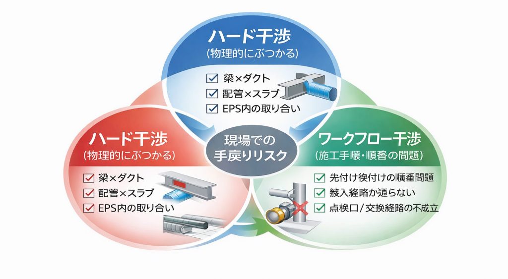 このタイプは放置すると工程に直撃するので、干渉チェックの中でも最優先で潰すべき領域です。ルート変更、梁下通しの可否、スリーブ位置の再検討など、早い段階で関係者を巻き込んで決めるほど手戻りが減ります。