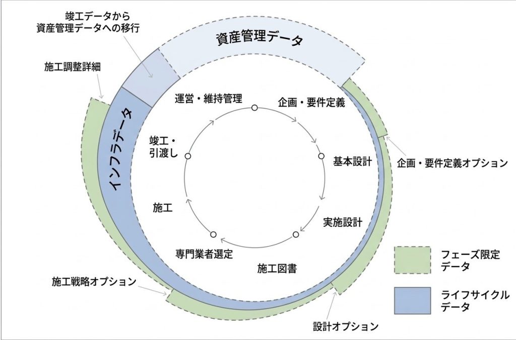 建物のライフサイクル全体を通じた情報の流れは、プロジェクトの進行を示す時計回りの円(プログラミングから維持管理へ)と、ライフサイクル全体で永続的に保持される「ライフサイクルデータ(ゴールデンスレッド)」の青いリング、そして特定のフェーズのみで一時的に使用される「フェーズ固有データ」の緑色の円弧として示されます。引き渡し時には、構築時のデータ(As-Built)が維持管理用データ(As-Managed)へと移行する重要な転換点が示されます。