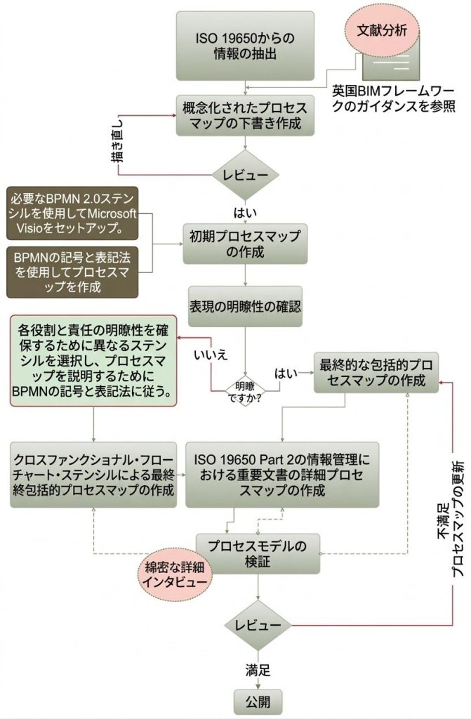 プロセスモデル構築の研究アプローチは、ISO 19650のテキスト要件の抽象化から始まり、BPMN 2.0を用いた初期プロセス・マップの作成、表現の明確さを問う判定ノードでの修正ループ、そして専門家への詳細なインタビューを通じたモデルの妥当性検証を経て、最終的に公開に至る厳格な品質管理プロセスが描かれています。