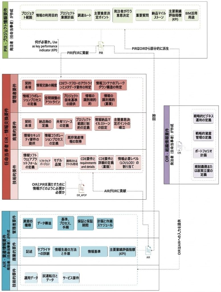 図解することで、発注者が作成する経営層向けの「OIR」とプロジェクト向けの「PIR」が、最も詳細で実行可能な層である「EIR」へと繋がり、「管理的要件」「商業的要件」「技術的要件」の3つに分類されることが視覚的に理解されます。また、OIRから建物運用に向けた「AIR」へ、そしてAIRからEIRへと要件が影響を与える関係性も示されています。