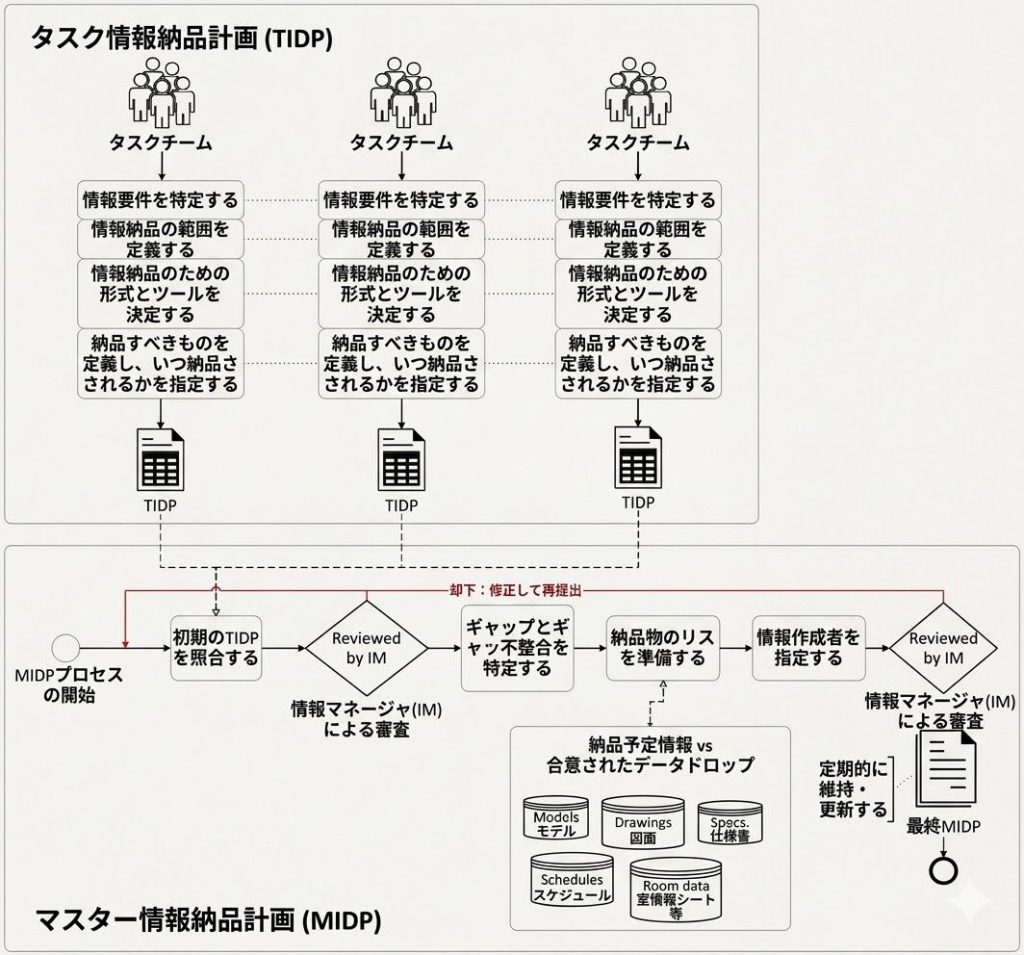 - MIDP(マスター情報デリバリープラン): 情報マネージャーがすべてのTIDPを収集し、ギャップや不整合を特定・チェックした上で統合し、承認された単一のマスター計画。