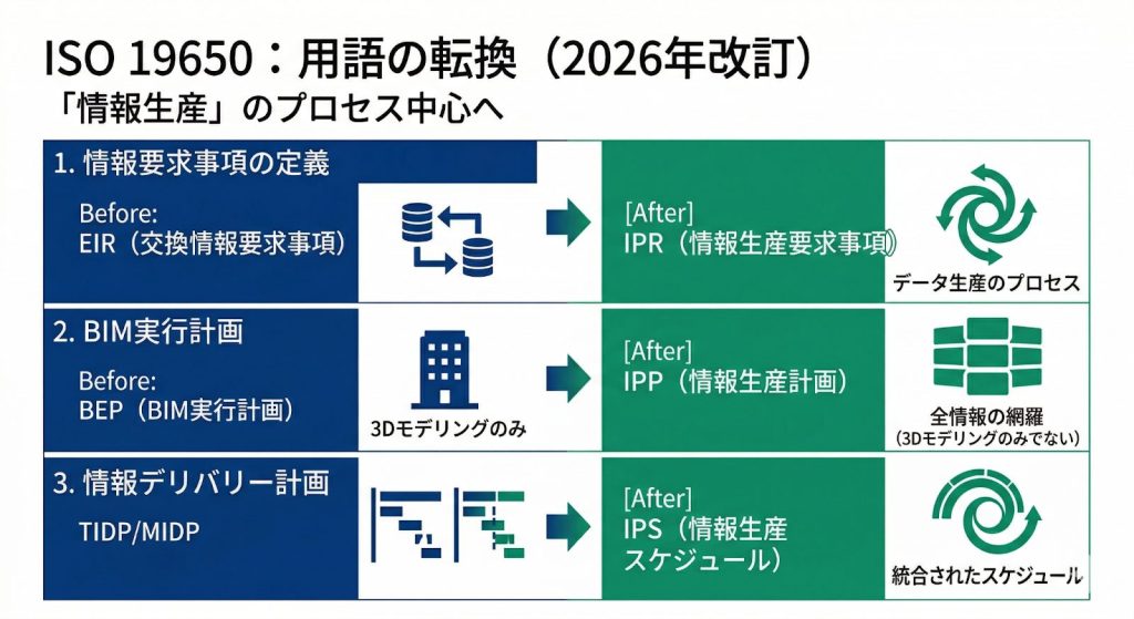 - ISO 19650 Standards: Terminology Debate — 2026年に向けた規格改訂と用語の変更(BIMからIMへの移行、EIRからIPRへの変更など)に関する分析。