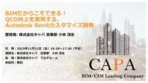 2025年11月21日(金)、東京都秋葉原のキャパオフィスにて、BIM(Autodesk Revit)活用セミナーを開催します。設計現場のQCD向上に興味がある方は、ぜひご来場ください。